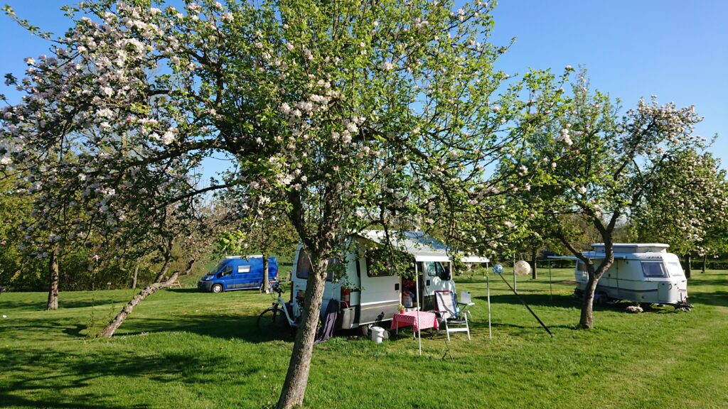 - De kampeerplaatsen in de hoogstamboomgaard zijn ruim 100m2 en autovrij.